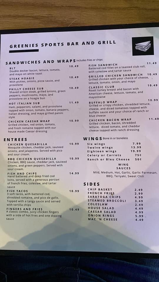 Greenies features a diverse menu that caters to many preferences. From hearty sandwiches like the Philly Cheese Sub to flavorful entrees such as Fish Tacos, diners enjoy variety. Comfort foods like Chicken Quesadillas offer familiar flavors alongside delightful sides like Saratoga Chips and French Fries.