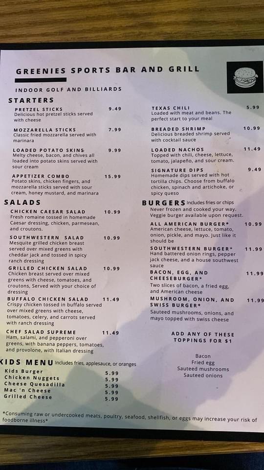 Welcome to Greenies Restaurant And Bar, your go-to destination in Milford, OH for delicious food and a lively atmosphere! Enjoy our full-service restaurant and bar, complete with indoor golf simulators and billiards for endless entertainment. Savor a diverse menu with traditional dishes and shareable plates, complemented by excellent cocktails and a remarkable beer selection. Join us for a quick lunch, a fun dinner, or quiz nights with friends, all while enjoying our accessible facilities. With a cozy patio and swift service, Greenies is perfect for solo diners and gathering with friends. Come experience a fun night out today!